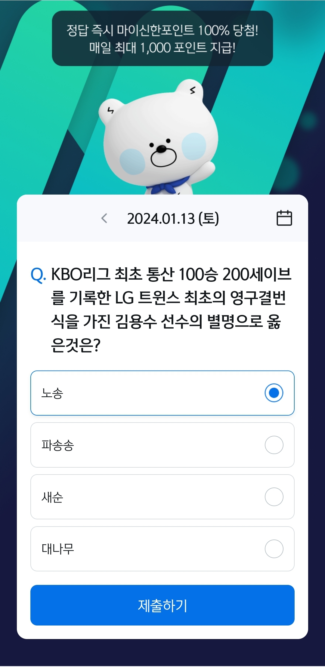 신한 쏠뱅크 쏠야구(쏠퀴즈) 1월 13일 문제 및 정답