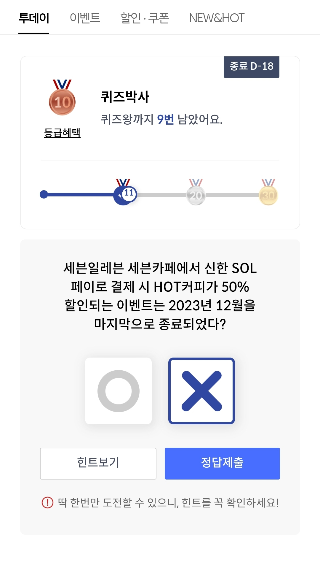 - 세븐일레븐 세븐카페에서 신한SOL페이로 결제 시 HOT커피가 50% 할인되는 이벤트는 2023년 12월을 마지막으로 종료되었다?