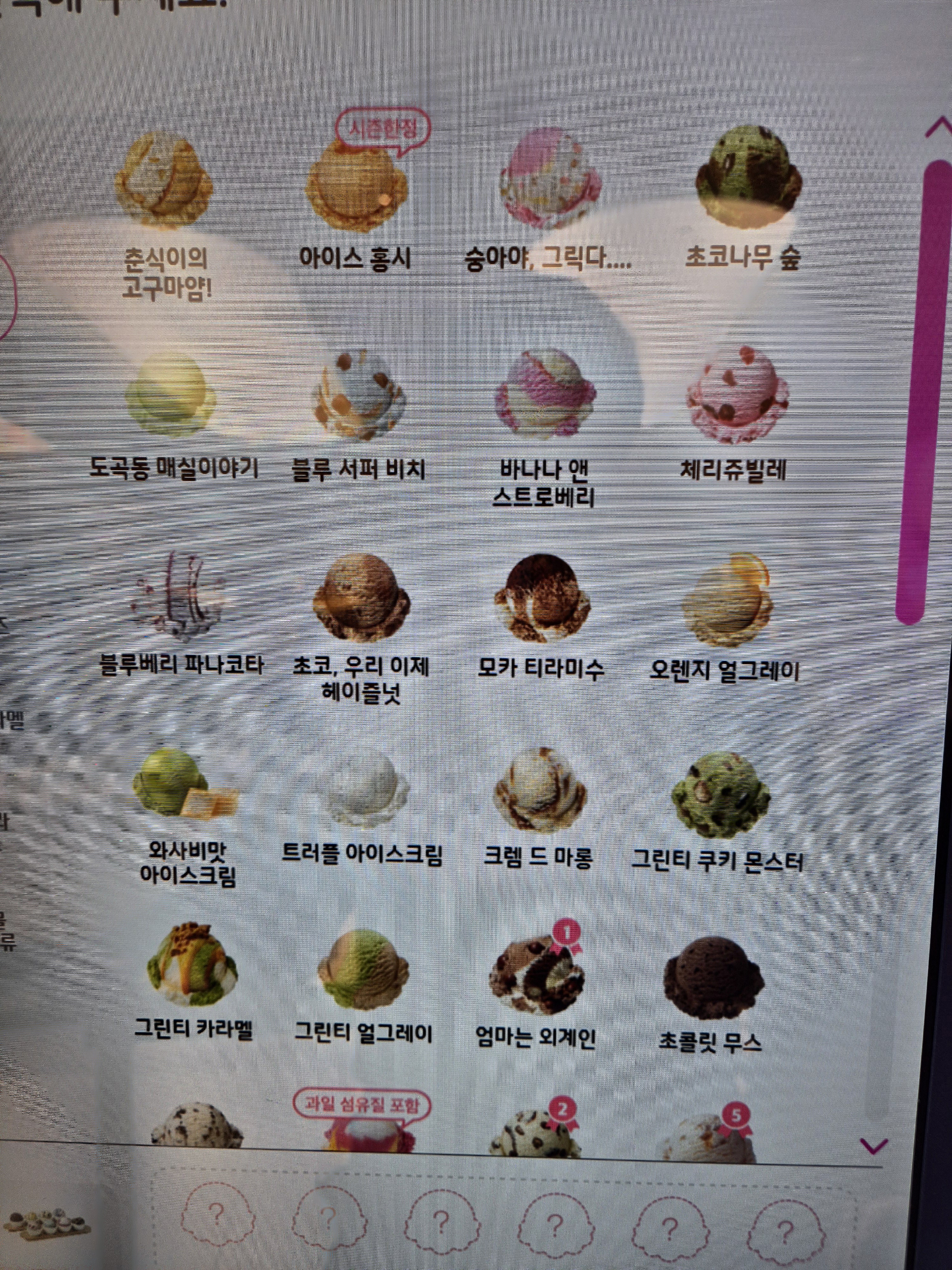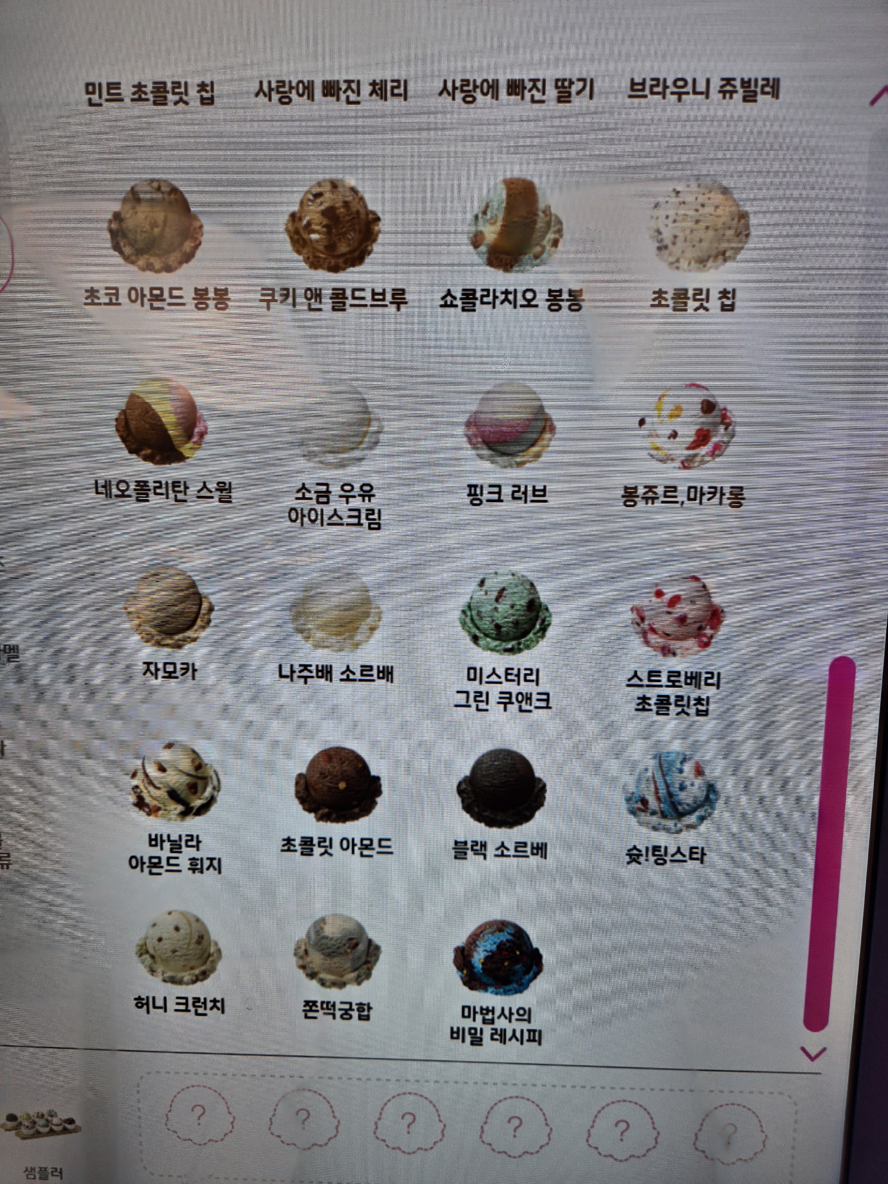 크렘 드 마롱, 소금 우유 아이스크림, 스크로베리초콜릿칩, 레인보드샤베트,