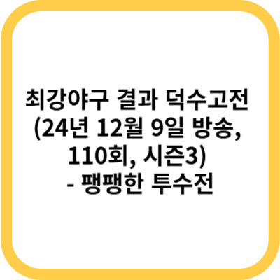 이상으로 24년 12월 9일에 방송한 최강야구 시즌3 24번째 경기인 덕수고 전반부를 살펴 보았습니다. 최강야구 관심 있으신 분들에게 도움이 되는 정보였길 바래 봅니다.