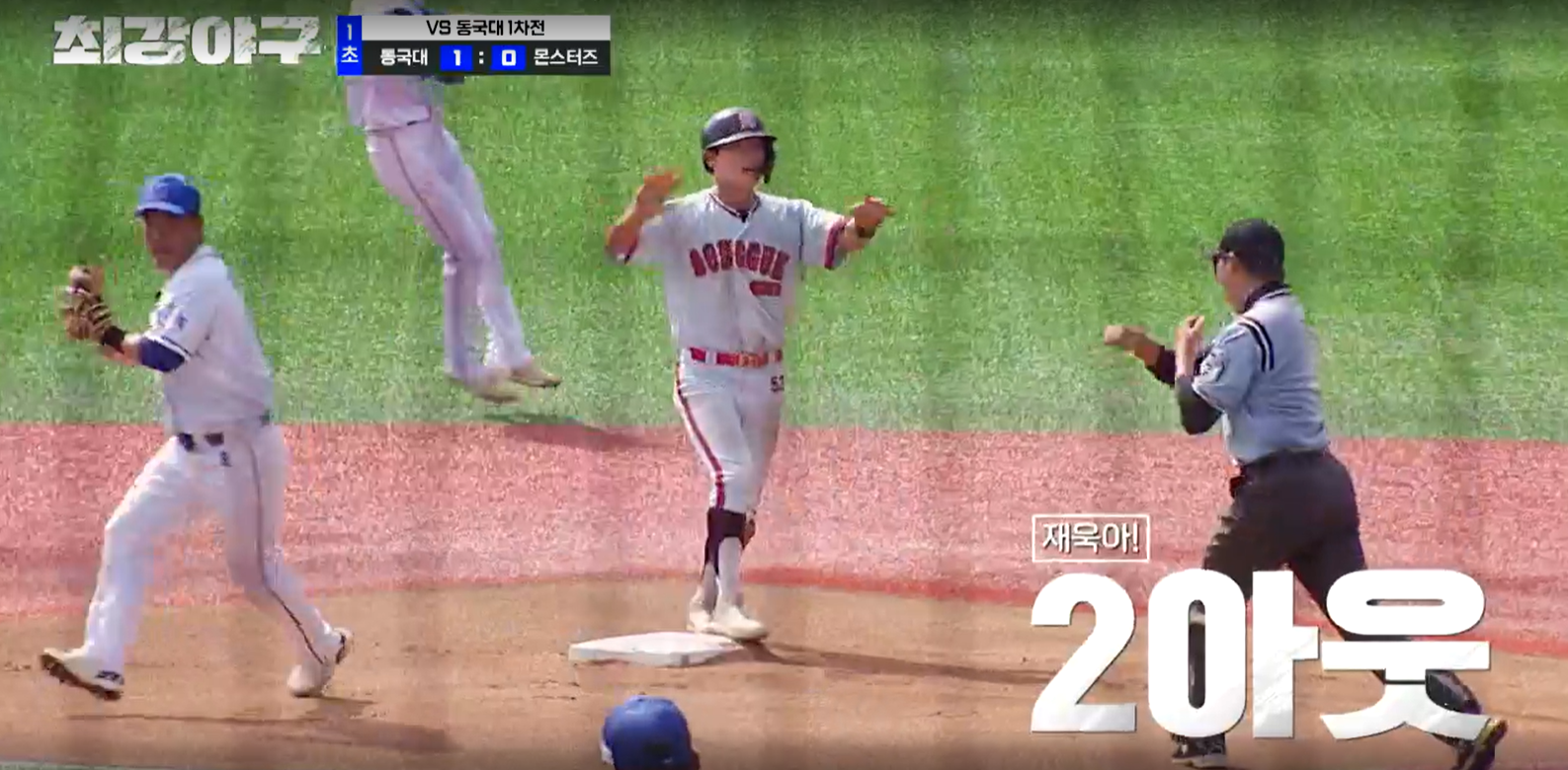 윤상혁까지 아웃되었으며, 마지막 타자인 정근우 역시 아웃되며 결국 승부는 동국대의 대역전승으로 끝납니다.