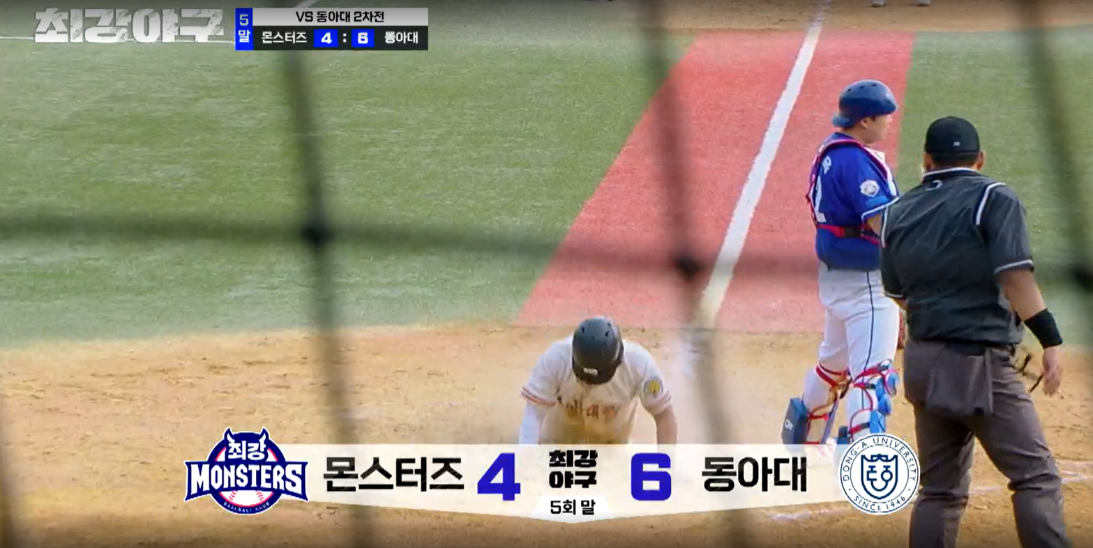 다행히 강민구는 다음 타자를 삼진으로 잡습니다. 그리고 다음 타자는 외야 플라이로 잡아냅니다. 그 사이에 동아대는 태그업을 하며 결국 동점을 만듭니다.