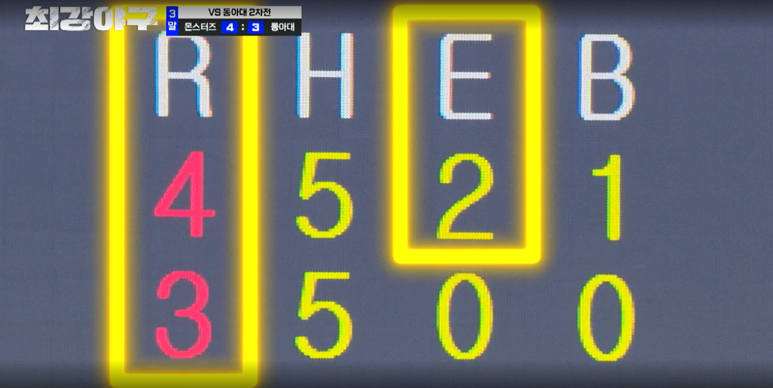 몬스터즈는 3,4,5인 고대한, 이대호, 김문호였지만 3자 범퇴로 끝납니다. 3회 말, 이대은은 동아대의 선두 타자를 삼진으로 잡습니다. 다음 1번 왕준석은 2루 땅볼로 잡습니다. 하지만 2, 3번에게 연속으로 안타를 허용합니다. 그리고 다음 타자에게 내야 안타를 허용하며 4대 2로 추격을, 그리고 이 상황에서도 임상우의 송구 실책이 나오며 4대 3까지 추격을 허용합니다.