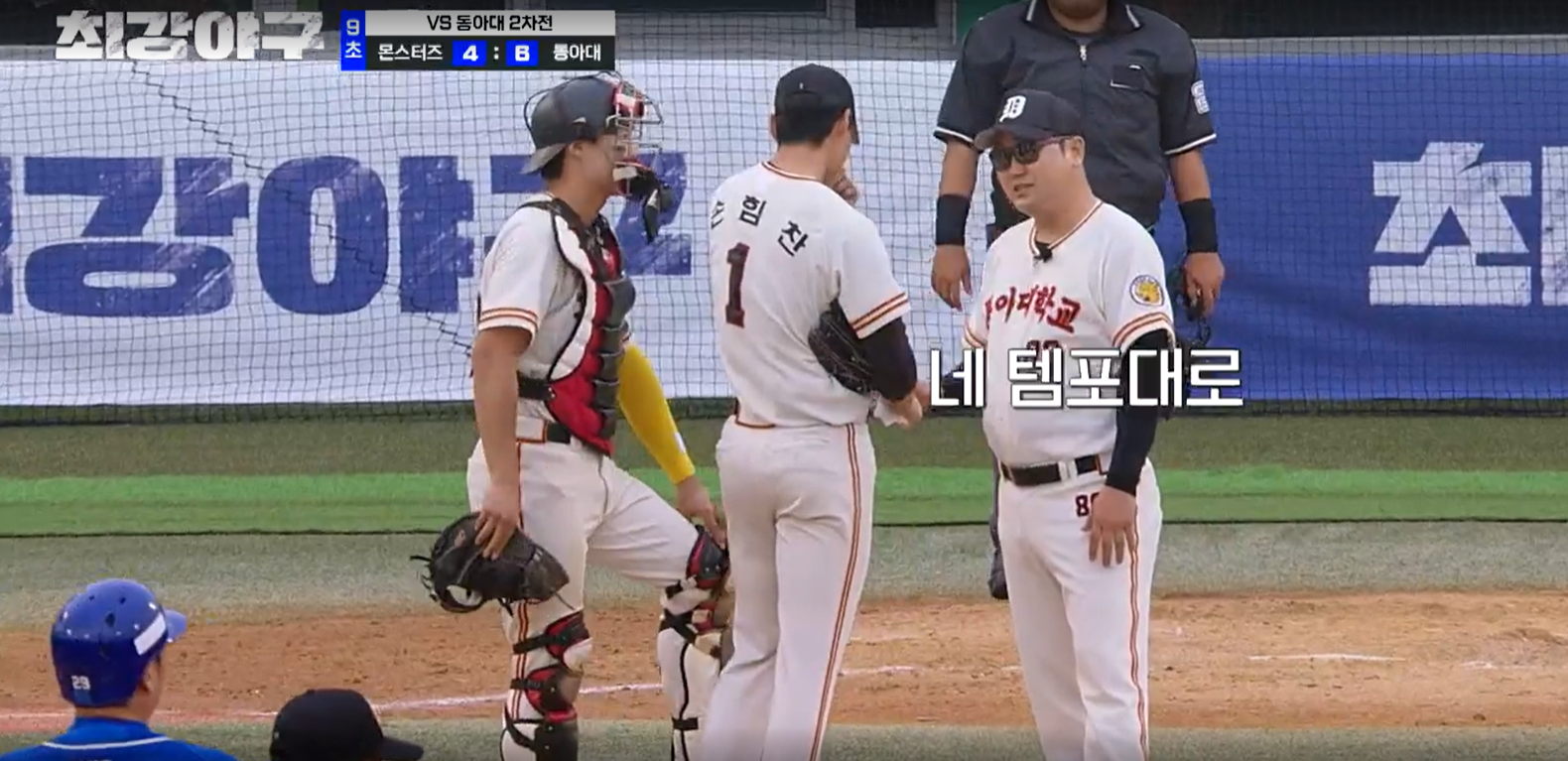 9회 초, 몬스터즈 공격은 이택근부터 시작됩니다. 다행히 이택근이 안타를 치고 나갑니다. 그리고 정의윤이 볼넷을 골라냅니다. 그러자 동아대 이재헌 감독이 타이밍 끊어주러 올라갑니다. 손힘찬 선수의 공이 좋았다보니 한 번 믿고 가는 것 같습니다.