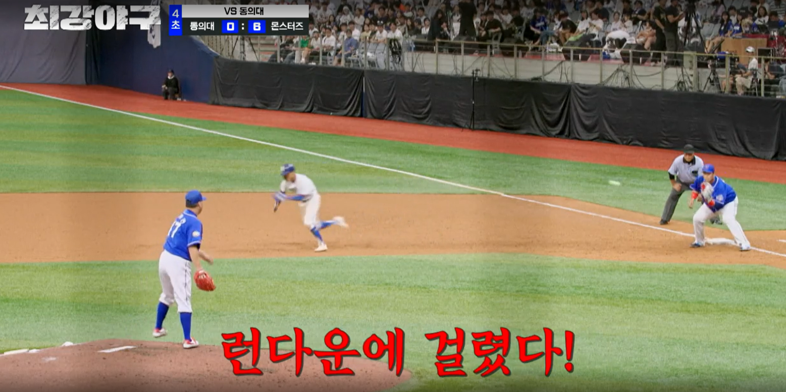 4회 초, 동의대 공격이 시작됩니다. 유희관이 선두타자를 볼넷으로 내보냅니다. 하지만 유희관을 주자를 런다운으로 잡아내며 루상에서 주자를 지웁니다.