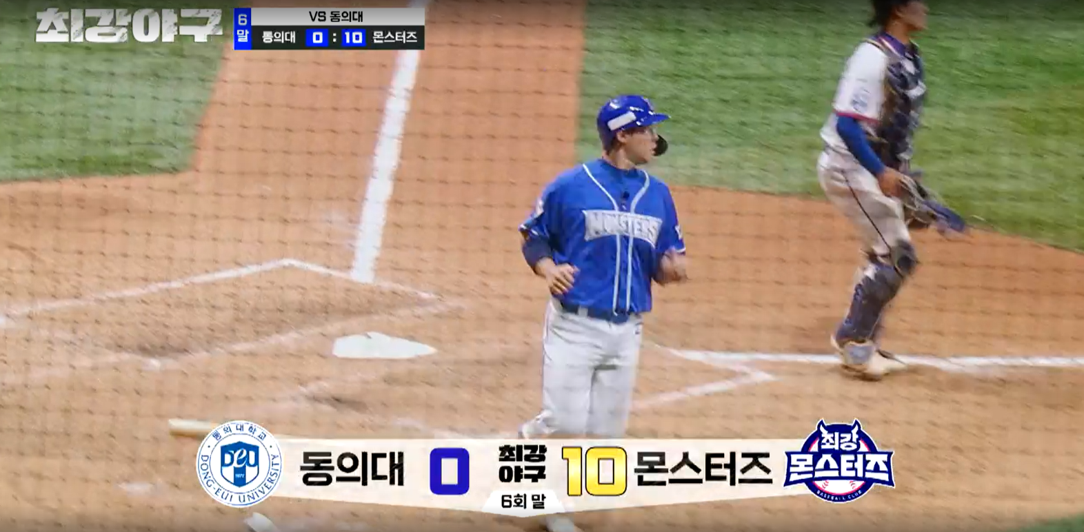 6회 말, 몬스터즈는 정의윤 타석에 이홍구를 대타로 냅니다. 이홍구는 몸에 맞는 볼로 출루합니다. 동의대는 투수 교체를 하며 5번째 투수로 1학년 송지훈을 올립니다.