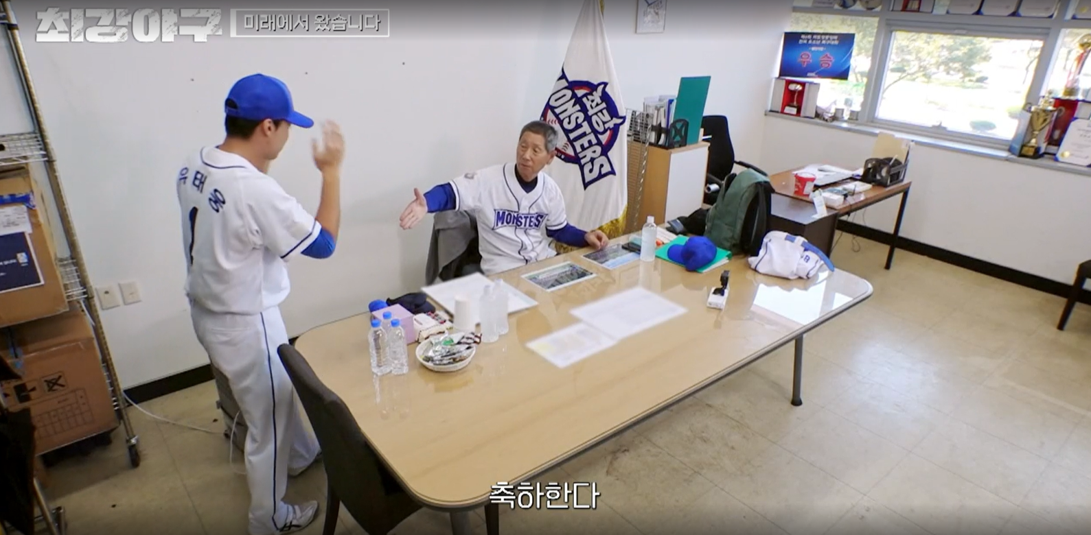 자이언츠의 레전드인 이대호 선수가 좋은 팀으로 가게 되었다며 축하해주고, 김성근 감독 또한 유태웅 선수를 축하해주는 모습이 나옵니다.