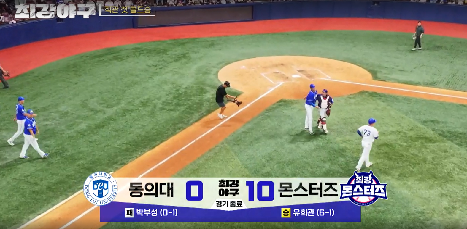 경기 종료. 몬스터즈가 10대 0으로 7회 콜드게임 승리를 거둡니다.