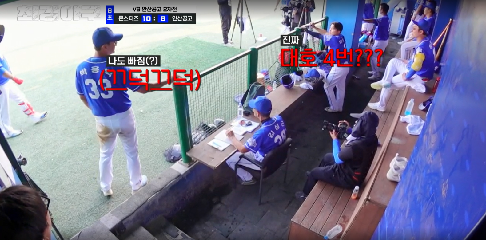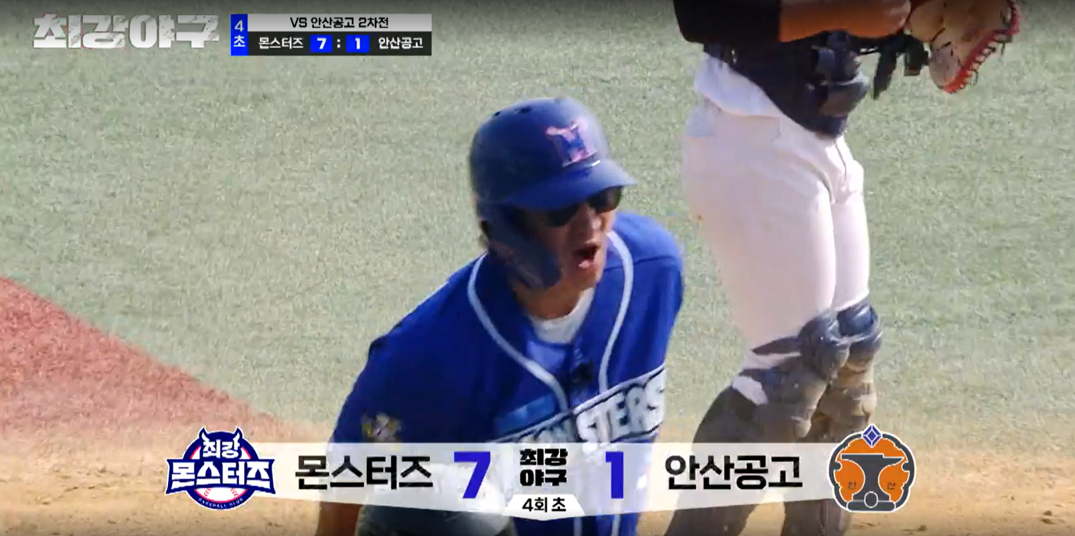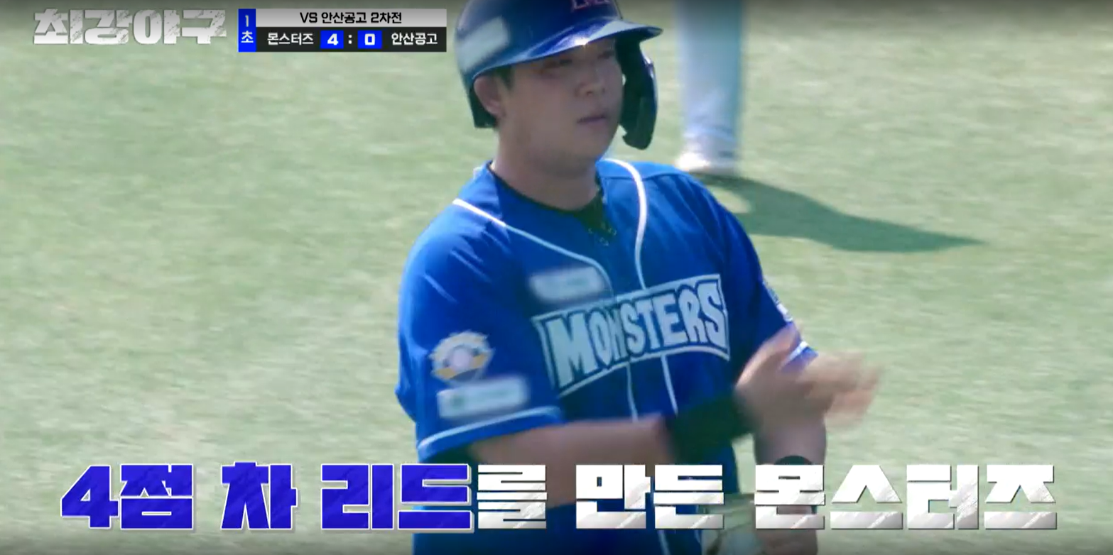그리고 김문호 본인도 유태웅의 외야 플라이 때 득점을 합니다. 3회 말 안산공고의 공격은 편집되었으며, 4회 초, 몬스터즈의 공격이 시작됩니다. 첫 타자인 박용택에게 볼넷을 내주자 결국 투수를 교체합니다. 오늘의 4번째 투수인 2학년 김용현 선수가 올라옵니다.