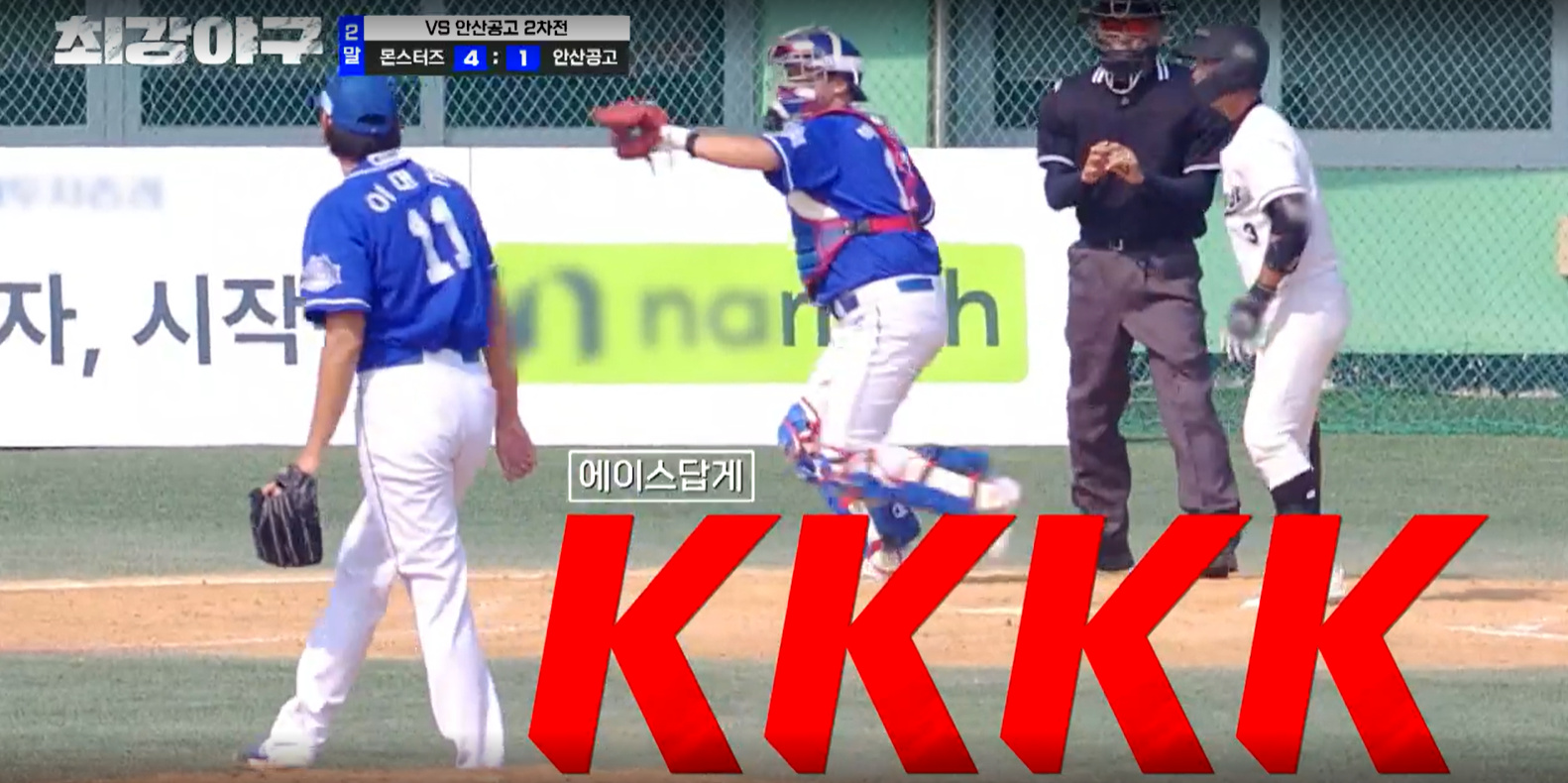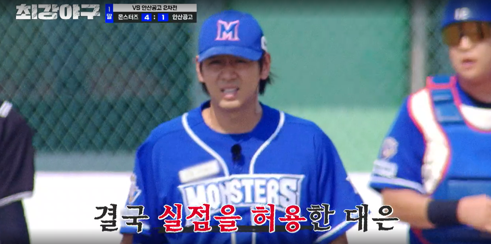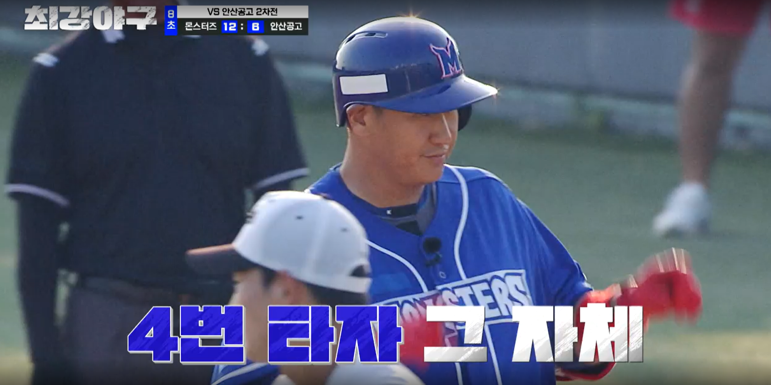 그리고 김문호 본인도 유태웅의 외야 플라이 때 득점을 합니다. 3회 말 안산공고의 공격은 편집되었으며, 4회 초, 몬스터즈의 공격이 시작됩니다. 첫 타자인 박용택에게 볼넷을 내주자 결국 투수를 교체합니다. 오늘의 4번째 투수인 2학년 김용현 선수가 올라옵니다.
