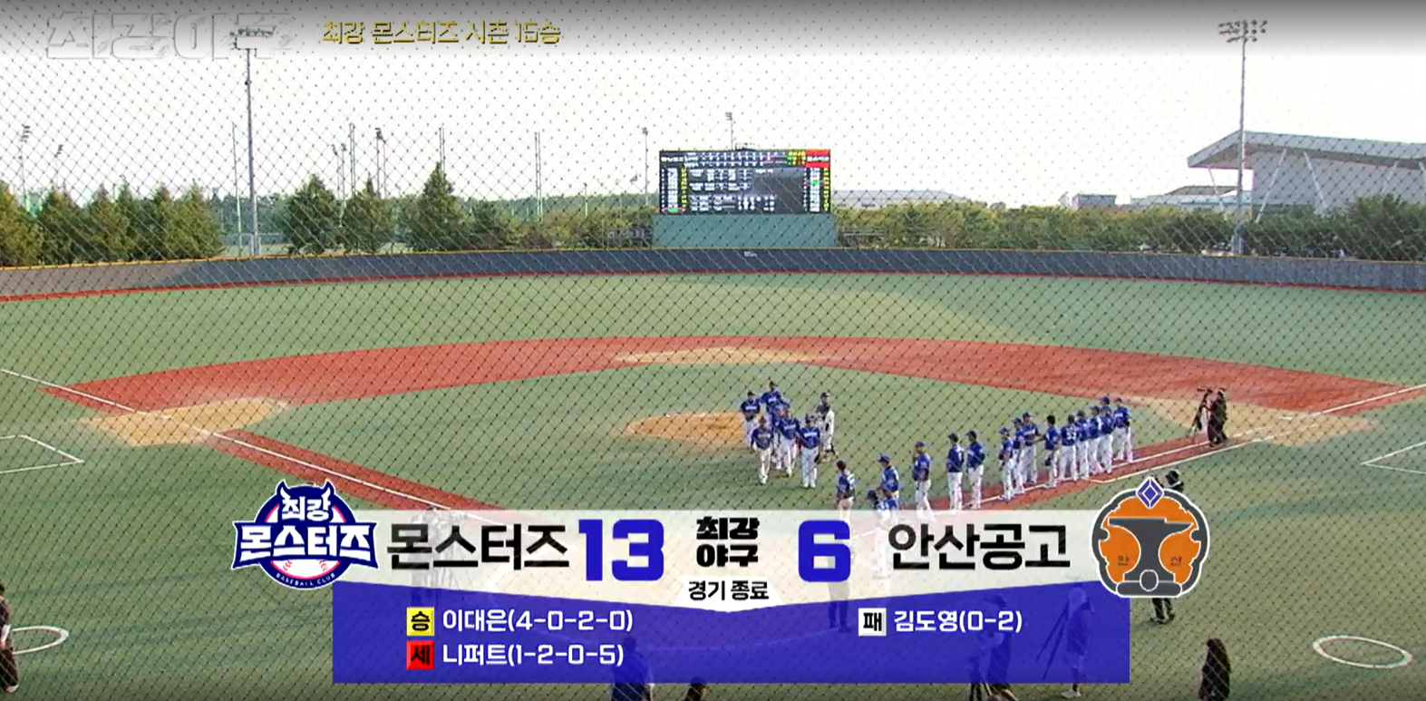8회말, 안산공고 공격은 편집되었습니다. 그리고 9회 초, 몬스터즈는 만루까지는 찬스를 만들었지만 추가점은 내지 못합니다. 9회 말 안산공고의 공격이 시작됩니다. 마운드는 여전히 니퍼트가 올라옵니다. 안타를 하나 허용하였지만 병살을 잡으며 경기를 마무리 합니다.
