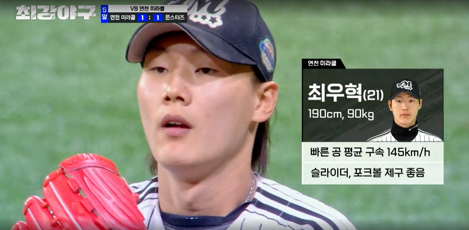 경기는 5회 말 몬스터즈의 공격부터 시작됩니다. 선두타자인 박재욱이 몸에 맞는 볼로 출루합니다. 하지만 정근우가 아쉽게도 번트 실패 후 삼진으로 물러납니다. 연천 미라클은 위기를 막기 위해 두 번째 투수 최우혁을 투입합니다. 최우혁은 경기도 리그 다승 1위라고 합니다.