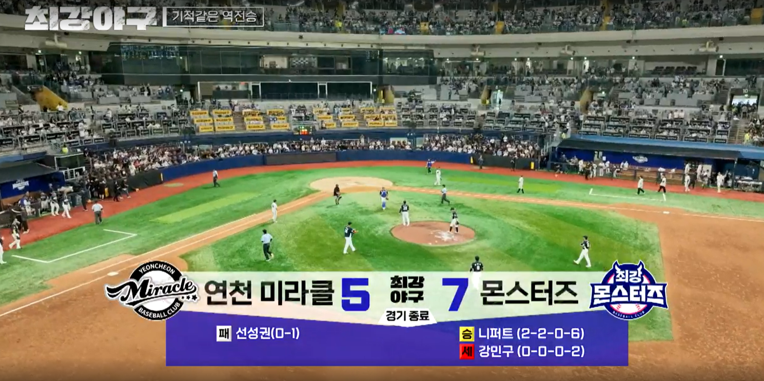 그리고 9회 초, 연천 미라클의 공격이 시작됩니다. 몬스터즈의 마무리는 강민구가 한 번 더 올라옵니다. 강민구는 자신만의 볼배합으로 선두 타자를 땅볼로 잡아냅니다. 하지만 미라클 또한 만만치 않습니다. 1사에서 3루타를 만들어 냅니다. 하지만 강민구는 빠른 공으로 2아웃을 잡아냅니다. 그리고 마지막 타자인 롯데 자이언츠 출신의 지시완을 삼진으로 잡아내며 경기를 종료합니다.