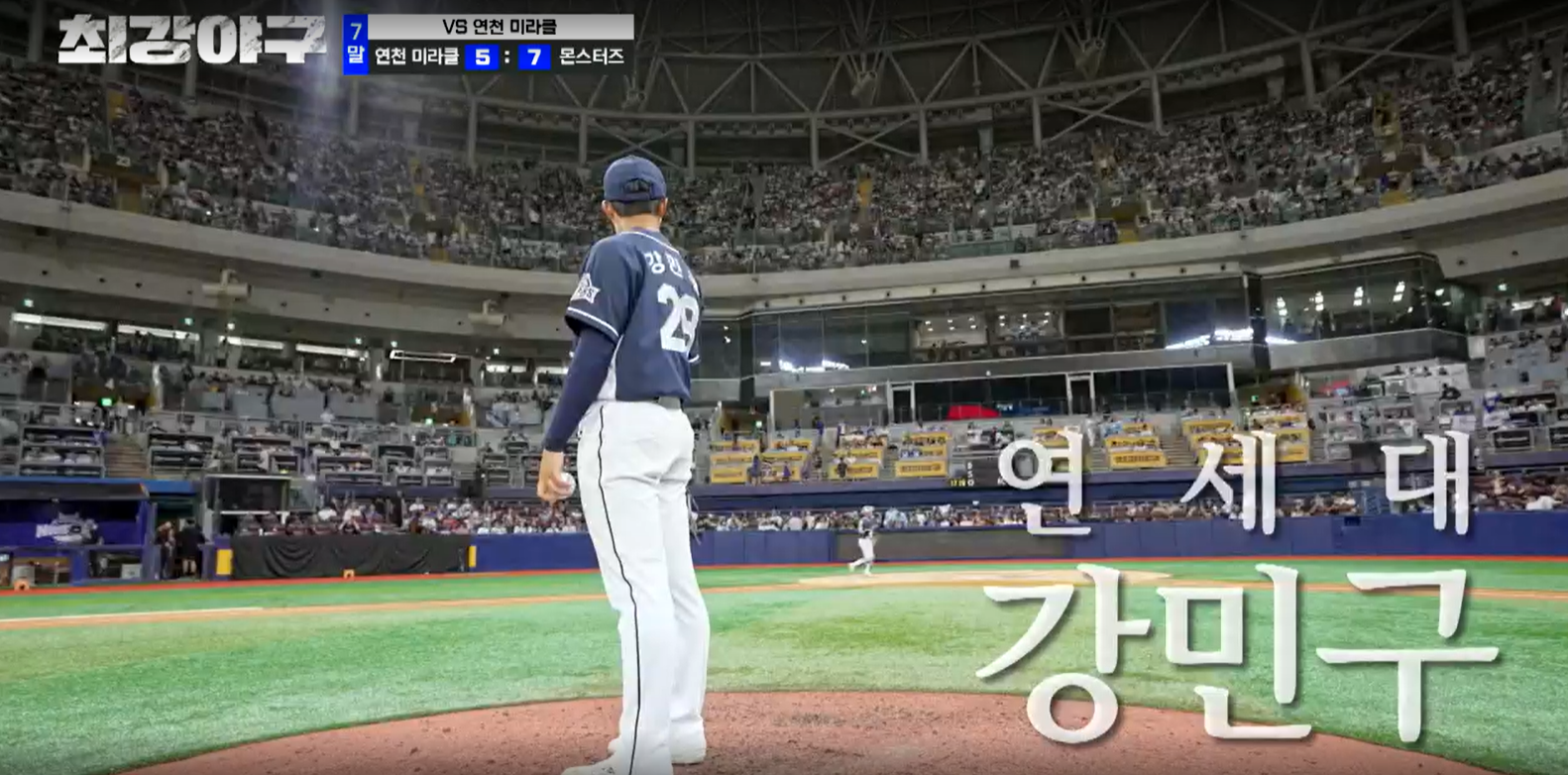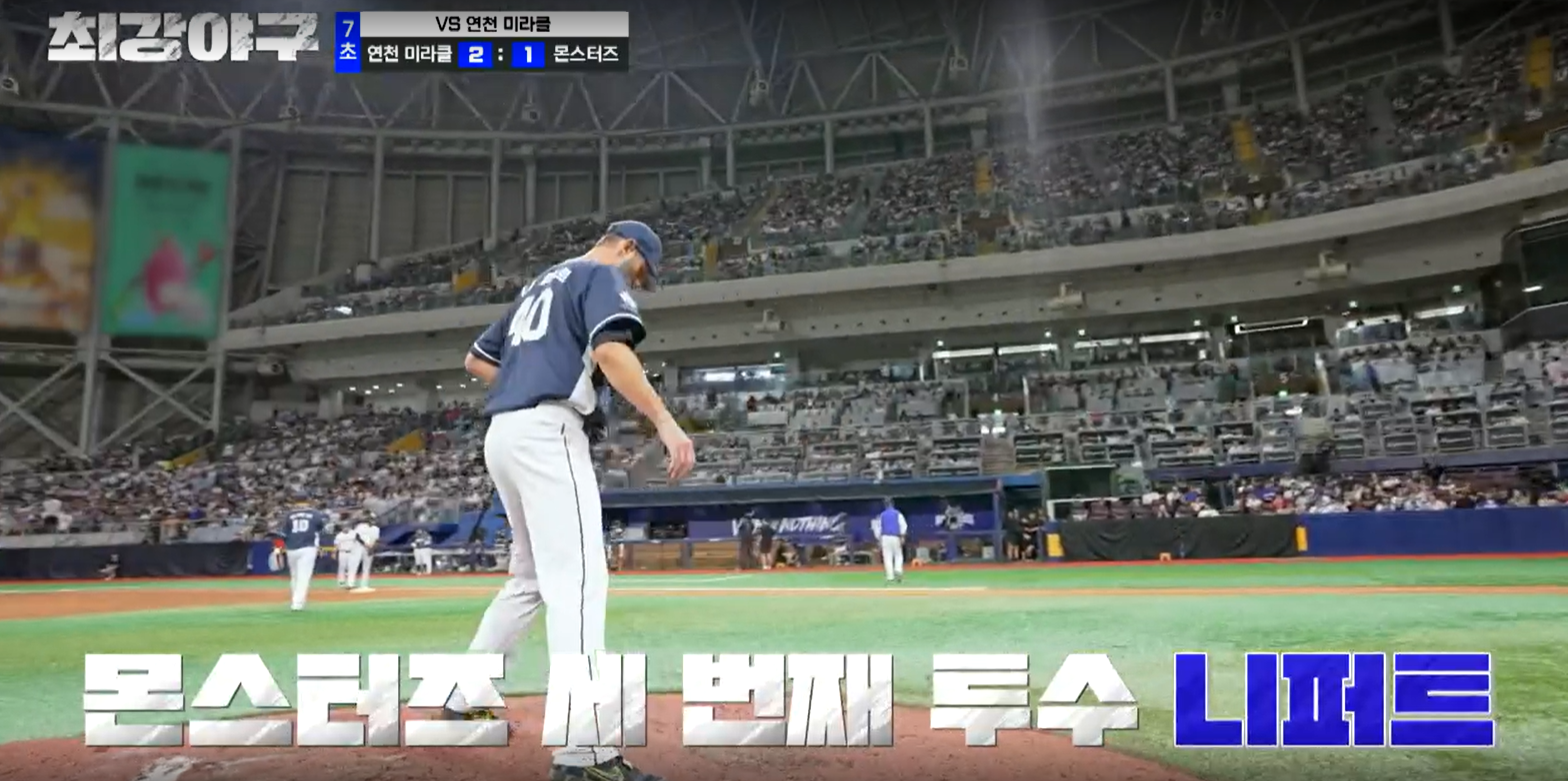8회 초, 연천 미라클의 공격이 시작됩니다. 몬스터즈의 마운드에는 연세대 출신의 영건 강민구가 올라옵니다. 아마 직관에서는 처음 보이는 얼굴이기 때문에 관중들은 웅성웅성합니다.