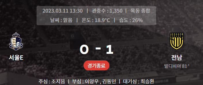 전남이 드디어 시즌 첫 승리를 거두었습니다. 전남은 서울이랜드와의 원정 경기에서 후반 36분, 상대 골키퍼와 수비수간의 미스를 재빨리 스로인으로 연결된 공을 크로스로 받아 발디비아가 골을 넣었습니다. 이후 전남은 골을 추가하는 듯했으나 핸드볼 파울 및 오프사이드로 취소가 되었습니다. 그래도 전남은 한 골을 지키며 첫 승을 거두었습니다.