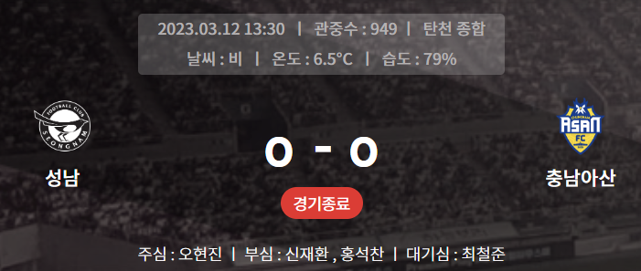 양 팀은 치열한 공방을 펼쳤으나 아쉽게도 모두 골을 기록하지 못하며 0대0 무승부를 거두었습니다. 찬스는 많았으나 양팀 골키퍼들은 멋진 선방을 펼쳤고, 특히 후반 36분 성남 신재원의 논스톱 발리 슈팅이 골키퍼의 선방에 막힌 것은 너무나도 아쉬운 장면이었습니다. 아마 이 슈팅이 골로 기록되었다면 한동안 회자되는 멋진 장면이었을 것입니다.