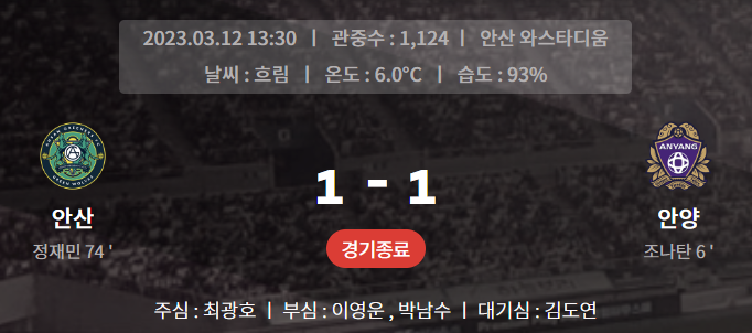 안양은 전반 6분 만에 조나탄이 깔끔하게 골을 기록하며 앞서 나갑니다. 안산은 홈팀답게 밀어붙였으나 전반전에 골포스트를 맞추는 등 운이 따르지 않았습니다. 그러나 결국 후반 29분 정재민이 오른쪽에서 올라온 골을 잘라 들어가며 동점골을 만들어내는 데 성공합니다. 이후 안산이 찬스를 더 잡았으나 골까지 연결시키지는 못하였고, 양 팀은 사이좋게 승점 1점씩을 나눠갖게 됩니다.