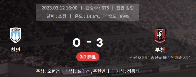 부천은 전반부터 세차게 천안을 밀어붙였으나 골을 만들어내지는 못합니다. 그러나 후반 11분 김선호의 선제골에 이어 후반 21분에는 송진규가, 후반 36분에는 안재준 선수가 멋진 터닝슛을 성공시키며 천안을 3대 0으로 완파하고, 공동 2위로 뛰어오릅니다.