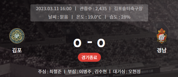 김포가 강팀 경남과의 경기에서 무승부를 이끌어냈습니다. 두 팀은 전반전부터 치열한 공방을 펼쳤습니다. 그러나 전반에 이어 후반에도 결국 골은 성공시키지 못하며 양팀은 0대 0으로 무승부를 거두었습니다. 그러나, 골이 터지지 않은 결과와는 달리 양 팀은 치열한 공방을 펼쳐 경기장을 찾은 양 팀 팬들은 끝까지 긴장의 끈을 놓지 못했을 듯합니다.
