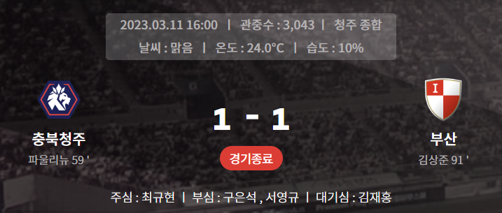 충북청주가 강팀 부산과 아쉽게 무승부를 거두었습니다. 부산을 홈으로 불러들인 충북청주는 후반 14분 우측에서 낮게 깔아준 크로스를 파울리뉴가 성공시키며 1대 0으로 앞서 나갑니다. 이후 잘 막아내는 듯했지만 후반 추가 시간에 부산의 김상준에게 골을 허용하며 1대 1로 비깁니다.